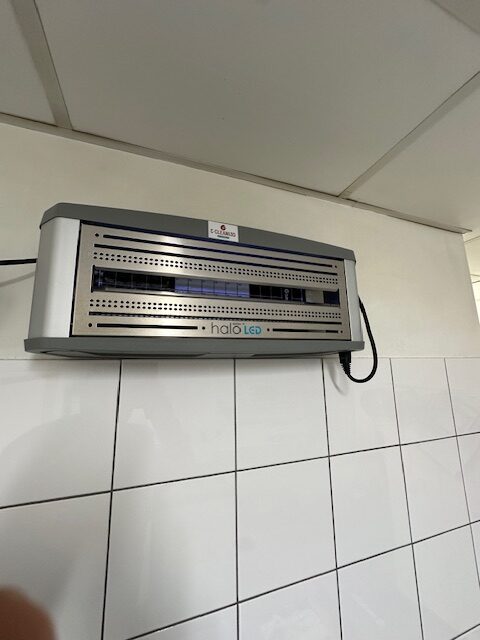 Pour la protection des cuisines professionnelles, nous avons installé des destructeurs électriques d’insectes volants LED HALO 15 avec bandes de glu.